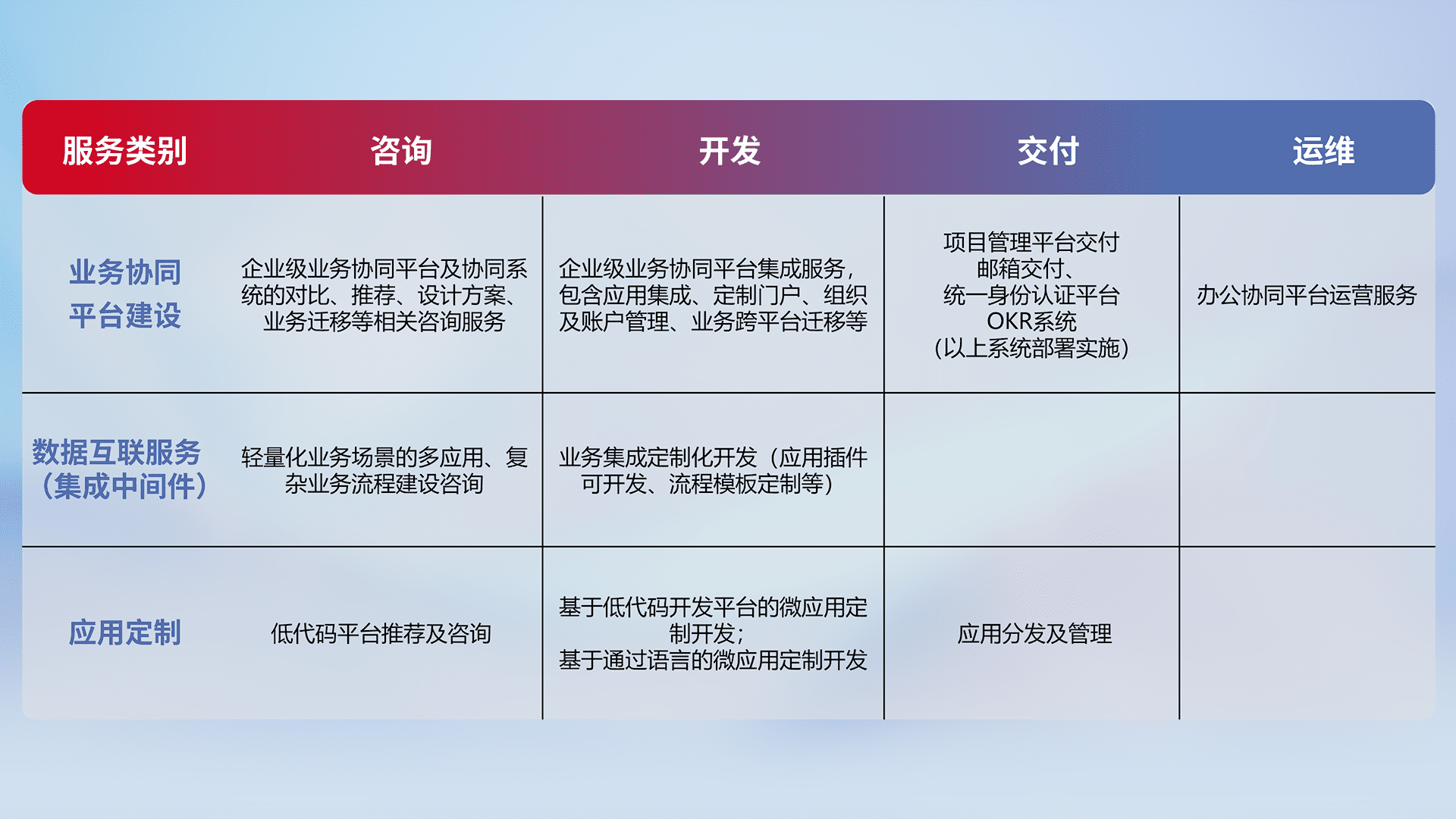 针对钉钉、、企微、、、IDaas等平台级产品提供产品的规划、、、方案、、、、交付、、、、定制化开发等服务,,,,实现如统一协同办公、、、智能客户服务、、混合会议管理、、、智能数据查询、、、等业务场景,,,实现数字化转型。。。。