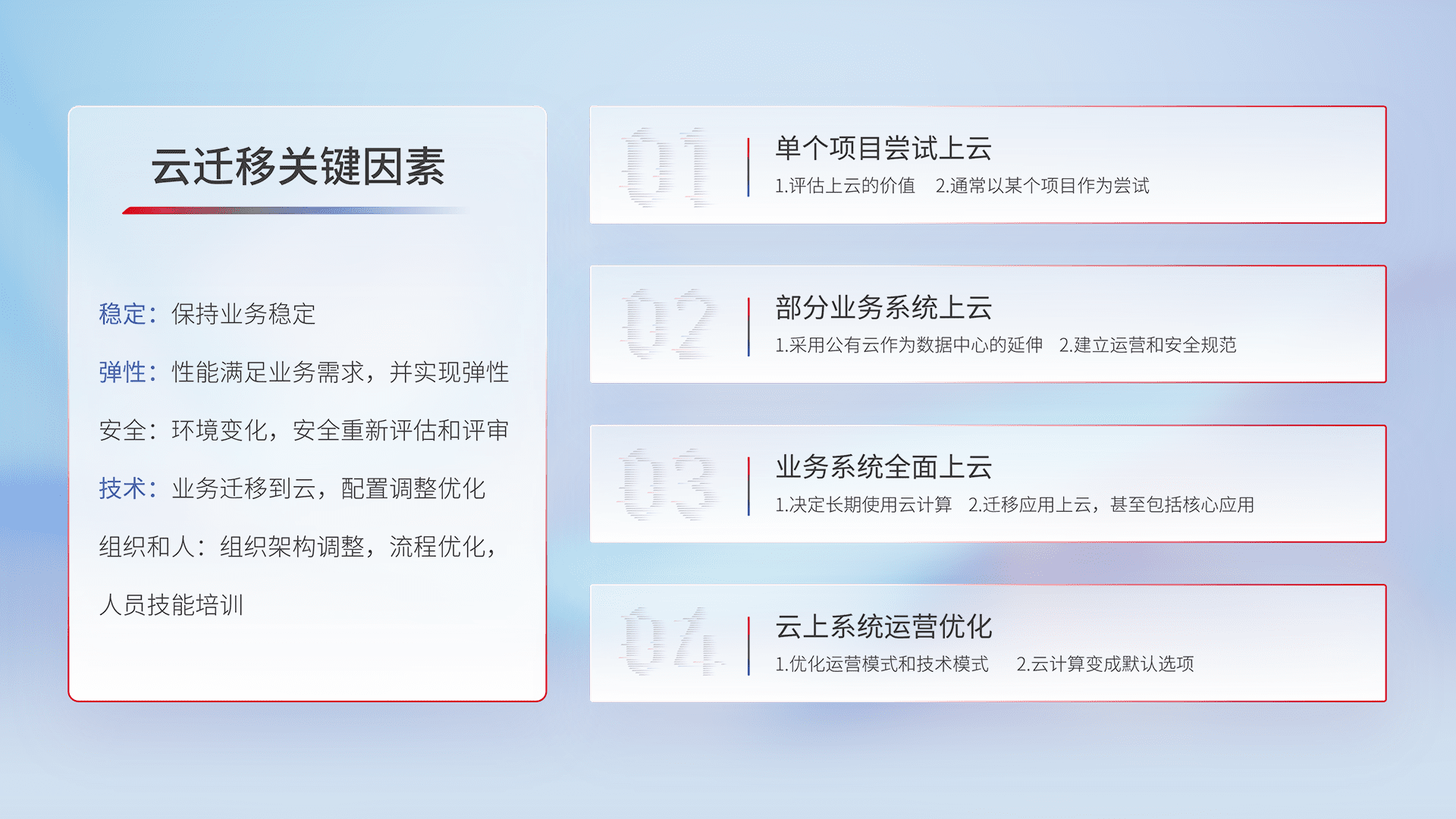 结合实际业务,,从规划设计、、、云平台选型、、云原生改造、、、数据迁移、、、集成交付,,,迁移全过程为客户识别最佳上云路径,,,做好风险识别管理,,,,设计网络架构、、、、身份权限、、、、安全审计合规、、、、操作审计、、日志审计、、、监控告警策略、、、、多站点容灾设计等,,对云上基础设施进行整体规划,,,,提升IT治理水平,,以满足弹性、、、高可用、、高性能的需求。。。。