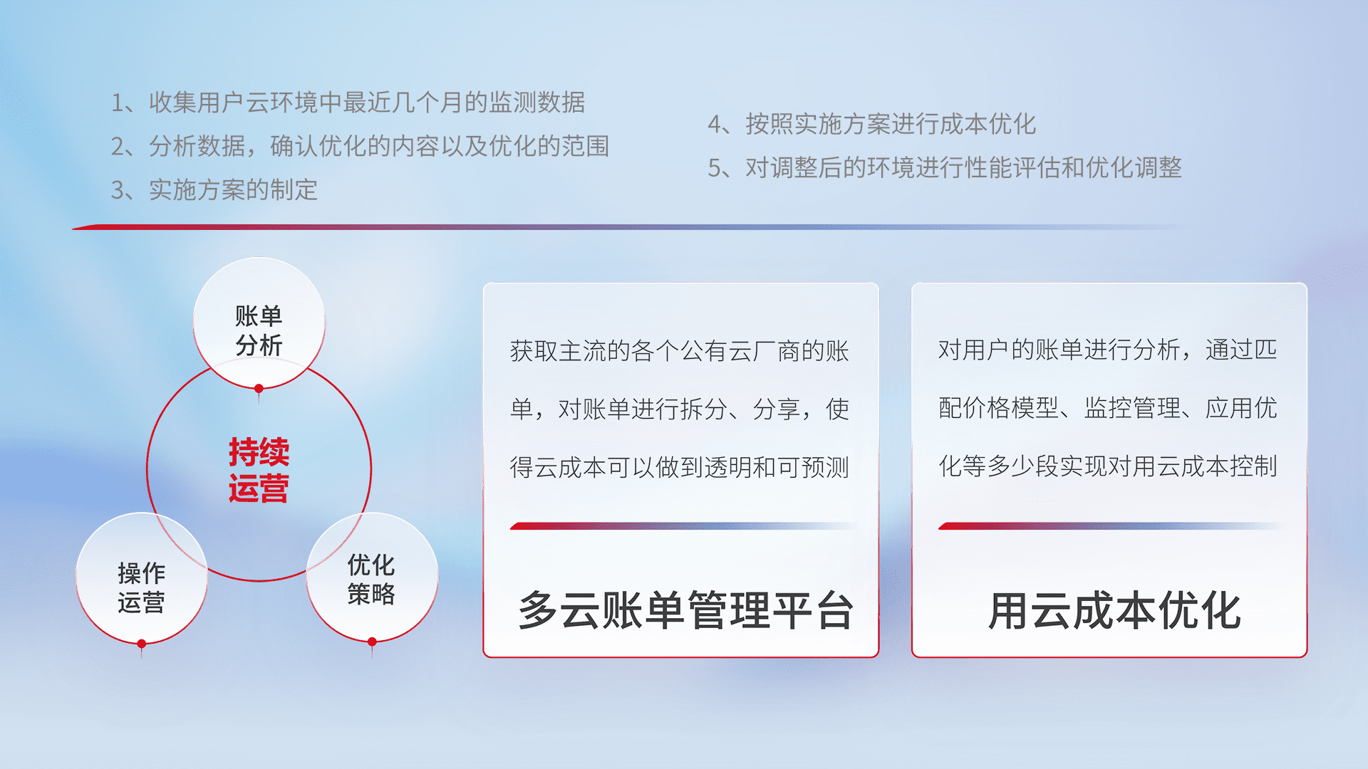 通过多云纳管,,,以统一的资源数据模型把客户的云资源进行抽象和封装,,,,进而实现对多云资源的统一操作,,,保障云资源管理的可靠性、、、稳定性与可用性。。。。量身定制化运维内容,,,配置、、、、开发运维、、、补丁管理、、、、备份、、监控、、、认证和访问管理、、审计和日常巡检等,,保障在用云过程中的可靠度,,,,稳定度以及高可用率。。。。